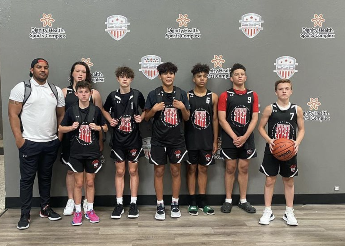 Players and coaches from UH Elite pose for a photo with players and coaches from the Southern-California-based program RC Bulls. Coach Crooms and Coach Cox were youth teammates on one of the top teams in the nation playing for the Bulls in the early 2000s.